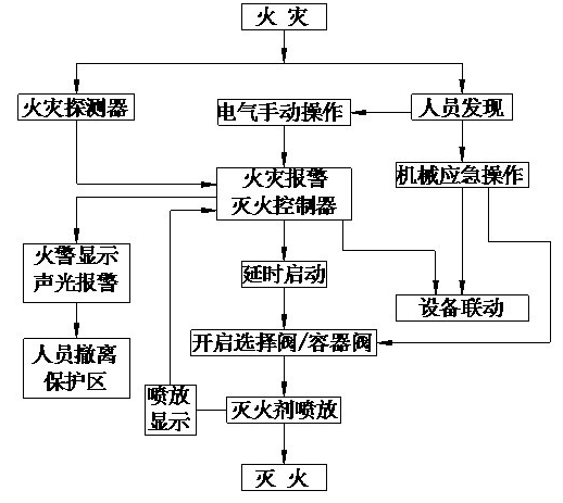 當兩(liǎng)種探測器發出火災信號時(shí),控製主機啟動警鈴和聲光報警器,聯動關閉防護區開口,進入滅火啟動延(yán)時(shí),達到設定的延時(shí)時間後,自動啟動(dòng)滅火(huǒ)係統。